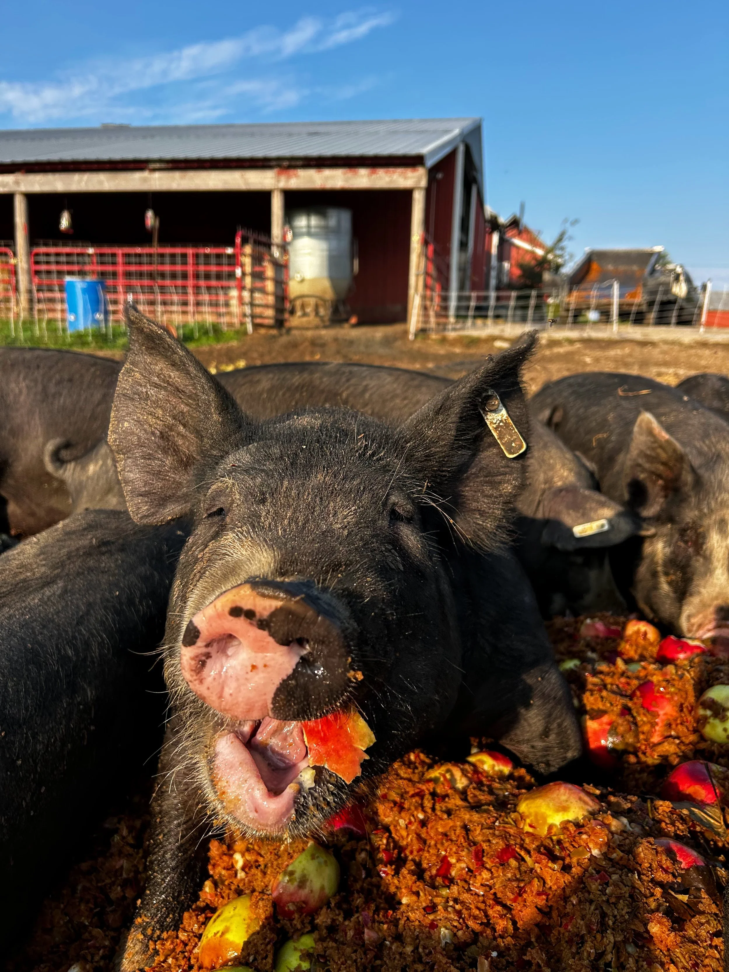 What makes our pork different? Our pigs graze a diverse mix of annual and perennial pasture with access to fresh water, and they are raised on culled organic produce from our farm and apple orchard, plus a Certified Organic field pea and barley ration free of corn, soy, and fish meal. All of which results in a clean, delicious flavor, firmer fat, and higher CLAs* with a healthier Omega 3:6 ratio. Our pork tastes exceptional and reflects the land it was raised on!
