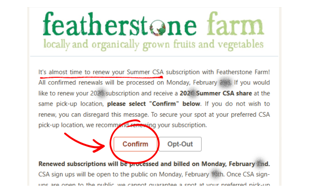 If you are not interested in renewing your CSA subscription, you can select “Opt-Out” or ignore this email. Only Confirmed subscriptions will automatically renew.